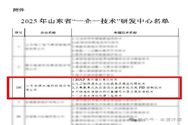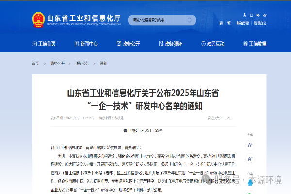近日,山东省工业和信息化厅正式发布2025年山东省“一企一技术”研发中心认定企业名单,本源环境(证券代码:874255)凭借在工业污水综合治理领域的深厚技术积累、持续的创新研发能力以及显著的行业示范作用,成功入选!这是山东省主管部门对本源环境技术创新体系、自主研发实力及未来发展潜力的高度认可,标志着本源环境的研发创新工作迈上了新的台阶,正式跻身省级创新平台行列。